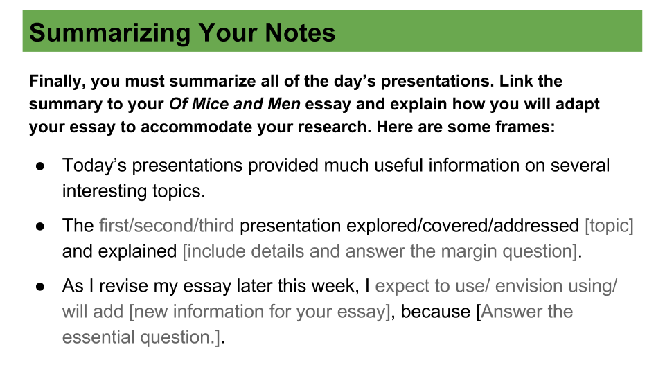 Students presented their research to their peers, taking notes on each other's presentations. After all the presentations, students annotated their notes and wrote the summary (below). Complete slides are at Google Classroom.